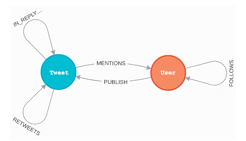 - Each Tweet is linked to its author via (:User)-[:PUBLISH]->(:Tweet).